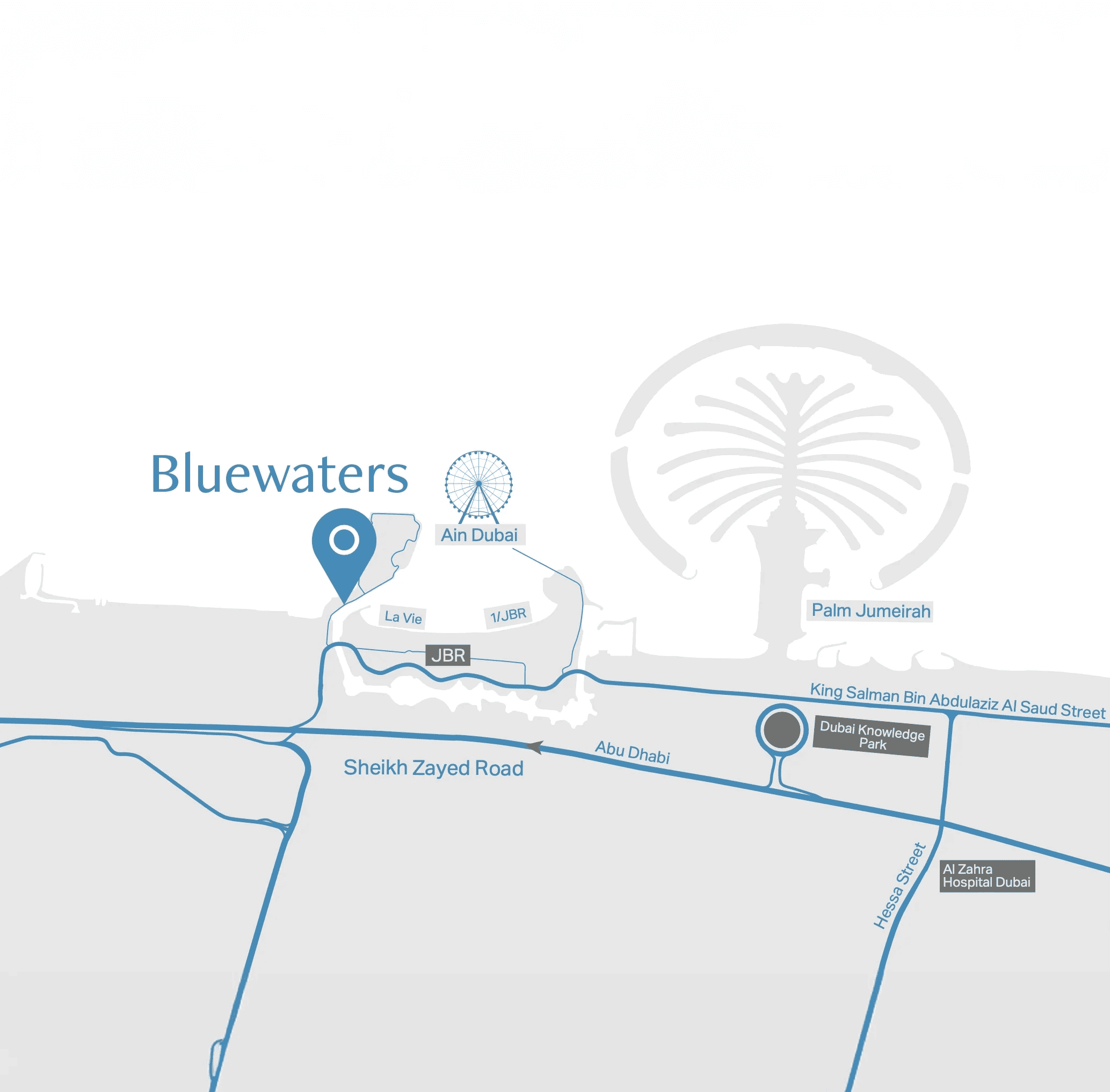 Bluewaters Island is a waterfront development conveniently located near Sheikh Zayed Road. The island is close to Dubai Marina, Palm Jumeirah, and Jumeirah Beach Residence, some of the city's most well-known and dynamic neighborhoods.